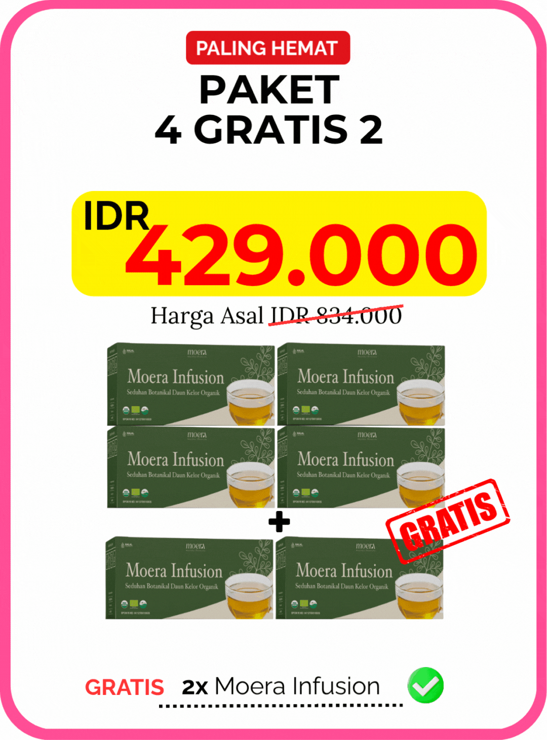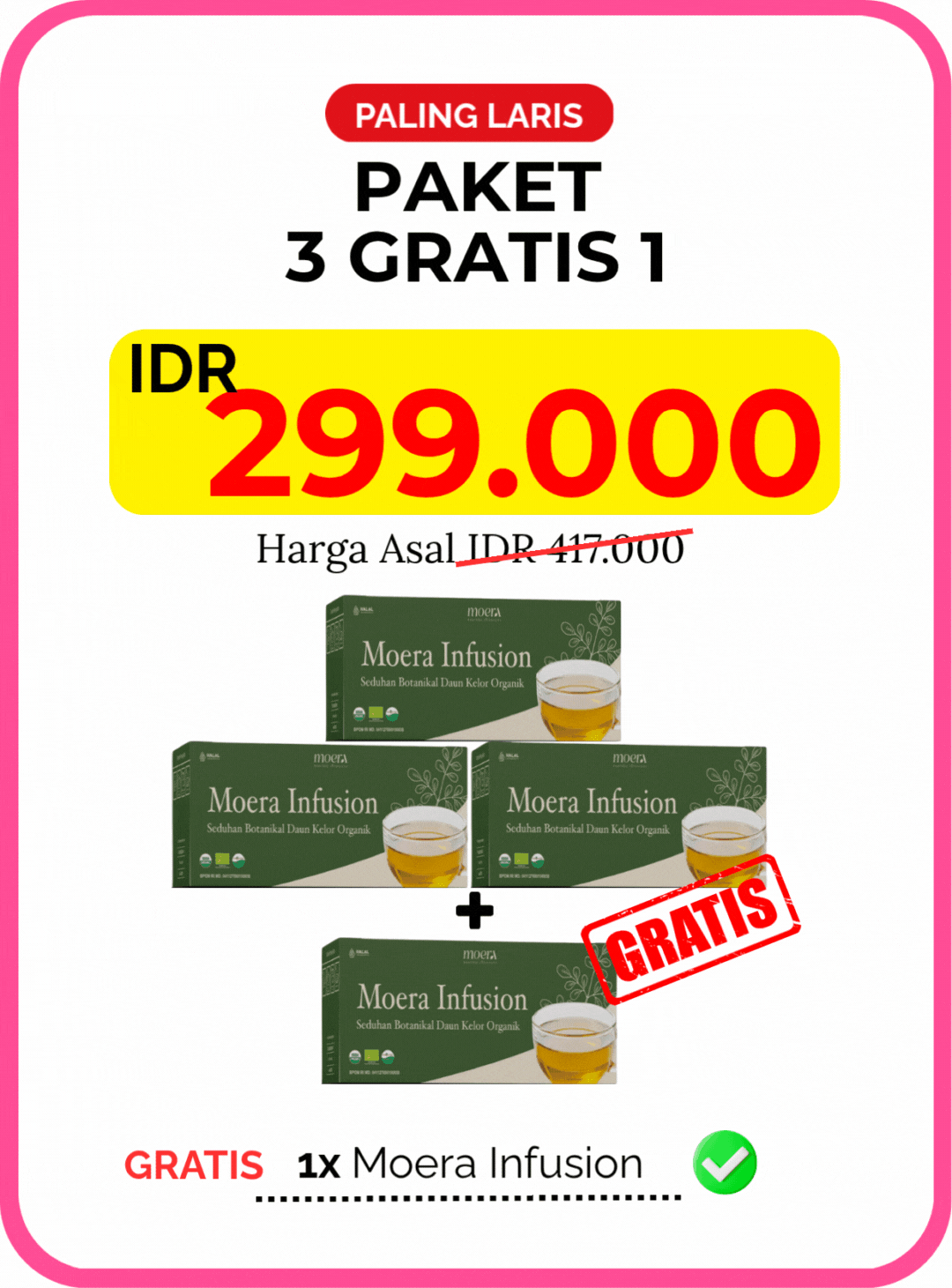 Ya, ada! Anda berhak atas 100% pengembalian dana jika tidak melihat hasil setelah konsumsi rutin selama 60 hari. Kami beri jaminan karena yakin dengan keberkesanan Moera Infusion.